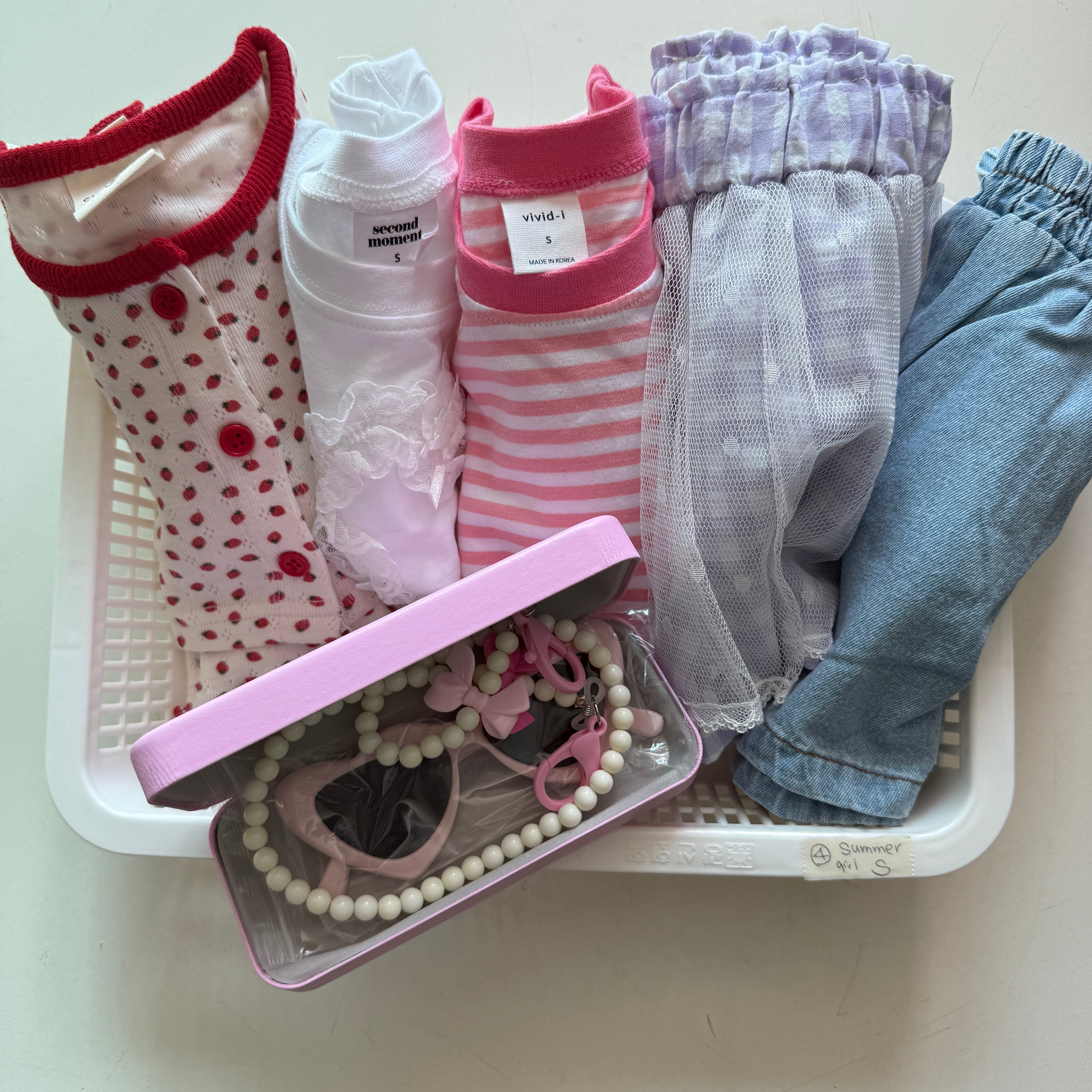 (韓国から発送)2025 Happy bag④ 夏物女の子~Sサイズ:1 Cardigan & Camisole Set / 1 T-shirt / 1 Sleeveless Dress / 1 Skirt / 1 Denim Pants / 1 Sunglasses